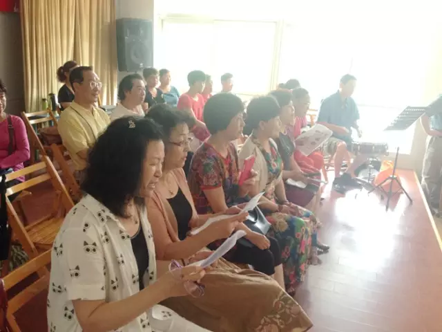 为纪念中国共产党成立95周年,唱响共产党好、社会主义好、改革开放好、伟大祖国好的时代主旋律,《我们心中的歌一一上海老战士、老劳模、老知青声乐交响音乐会》将于7月19日下午在杨浦大剧院隆重举行。 继2013年知青交响音乐会举办后,第二届知青交响音乐会今天合乐。这次合作的单位是上海白玉兰管弦乐团。 排练在火车站附近的和泰小区居委会。白玉兰管弦乐团名不虚传,阵容强大技艺超群。排练起来,一丝不苟。据说他们从早上排练到现在了,指挥已经汗流浃背。非常敬佩他们的敬业精神。