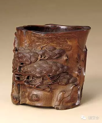 杯为竹根雕,撇口,平底。外壁浮雕蟠松老干,枝干盘缠。纹饰疏密有致,层次清晰。