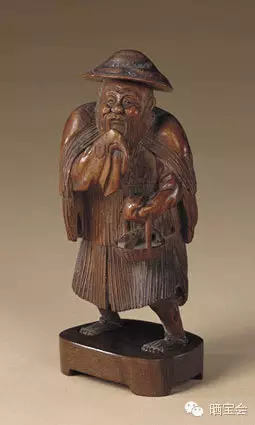 渔翁竹根制,老人面露微笑,头戴斗笠,身披蓑衣,手提小筐,足蹬草履,边躬腰前行,边举起前臂用长袖擦抹腮下的雨水。