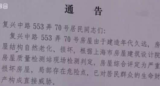 6月15号,70号大楼内贴出了通告,说因房屋“严重损坏,决定依法排险解危,全体居民在8月15日前,办妥撤离手续”。这危房叫了这么多年了,大家也都盼着早点大修,可也不能这么仓促,说搬就搬呀。 据二楼的这位居民介绍,1976年,原卢湾区房管部门,在70号整栋三层楼房的基础上,又加了二层,但问题是,在加层建造过程中,一至三层的老房子出了问题。 上世纪九十年代起,居民们就听说这里已经成了危房,只是一直没有确切的处置方案。这几年,有关部门多次前来监测,正式确认属于危房。今年初,他们听说房屋要大整修了,可不知什么原因,既没人来动员、听取意见,也没公布修缮、补偿方案,如今却要限期搬离,这让他们很难接受。 对此,现场工作人员的解释是,他们有10个工作小组在开展一对一的工作,负责与居民签订搬离补偿事宜,补偿费用也是有标准的。至于居民们提出的这些问题,他们会向上面汇报。 记者走访了相关部门。街道负责人说,自2012年起,有关70号危房的修缮事宜就被列入议事日程。而专业部门最新检测,确认为危重损害房屋,必须加固修缮。之前,他们在部分居民中征求过意见,撤离安置补贴也是有参照标准的。当看看新闻Knews记者问道为何居民从没看到过,负责人则回答说,包括撤离安置补贴标准和施工方案都可以到办公室来看。 房管部门领导则表示,今年雨水特别多,加剧了对这栋房屋的危害,局部已出现危险点,从这个角度出发,依据相关法规,和当地街道作出了紧急避险措施,希望居民们能从人身安全的角度出发,配合做好修缮工作。 (责任编辑:北风) |