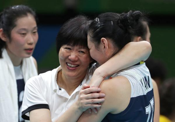 中国女排杀入里约奥运会决赛,郎平与队员激动相拥。