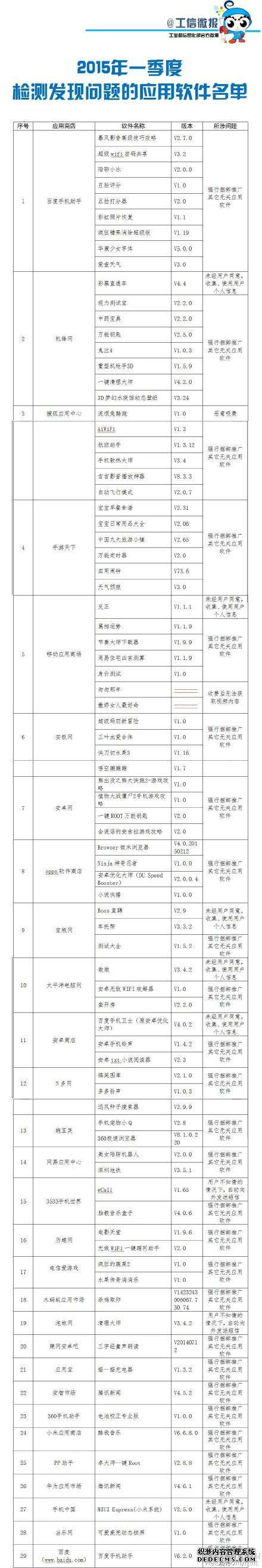 近日,工信部发布了电信服务质量通报,在对手机应用商店架上软件的检测中,共有82款手机软件涉嫌存在问题,百度手机助手、万能钥匙等手机软件上榜。