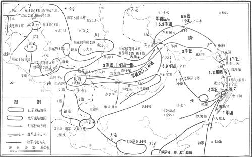 第八章 四渡赤水(上) 1935年1月19日,蒋介石下达《长江南岸围剿计划》,企图将中央红军压迫于川江南岸地区,“合剿而聚歼之”。 参与“合剿”行动的国民党军部队共约四十万人,与湘江战役的总兵力基本相当。而中央红军当时的兵力则只有三万七千余人,虽经过休整,得到补充,但与国民党军的兵力对比不足1∶10,力量极其悬殊。 1月27日,军委纵队到达土城,而追击的川军郭勋祺旅和潘佐旅则到达习水的木南坝、三元场地区,并继续向土城前进。1月28日,红3、红5军团从南北两侧向进入枫村坝、青杠坡之川军郭勋祺旅发起进攻。中革军委急令预备队红2师投入战斗,协同红3、红5军团和干部团牢牢地控制了道路两侧的制高点,将川军压到了平川地带。双方形成对峙。 一渡赤水,扎西整编 土城战斗陷入僵持,而川军的后续部队正在源源赶到。其模范师第3旅已经增援到位,教导师第2旅正由古蔺向土城方向迂回堵截,赤水方向的两个旅另一个团正从西北向红军侧后攻击。在土城地区,川军已经集中了六个多旅。红军前有重兵,后有赤水河,如果继续恋战,后果将不堪设想。 ![]() 土城渡口 毛泽东之所以成为红军伟大的统帅,就在于他的军事指挥从来都不会墨守成规,从来没有固定的和一成不变的作战计划,一切都是从实际出发,着眼于扬长避短,克敌制胜,敢于并且能够修正被实战证明是不可行的计划,在极度不利的局面下,出奇制胜,化险为夷,变被动为主动。 土城战场的激战尚在进行,毛泽东已经敏锐地觉察到,这是一场难以为继的危险战斗,再战对红军极为不利,因而果断地做出决定:立即撤出战斗,西渡赤水,甩掉追敌,挺进川南。 中革军委召开紧急会议,毛泽东在会上提出:鉴于川军重兵云集,原定从赤水北上,在泸州、宜宾间渡过长江的计划已经行不通,红军应该果断地调整进军方向,作战部队与军委纵队彻底轻装,从土城渡过赤水河西进,向古蔺南部推进,寻机北渡长江。会议讨论并通过了毛泽东的建议。1月29日3时,中革军委发布命令:“我野战军拟于今(29)日拂晓前脱离接触之敌,西渡赤水河向古蔺南部前进。” 各项工作迅即紧张而有序地展开。朱德、刘伯承在前线指挥部队顺序撤离阵地;工兵部队在周恩来的亲自指挥下,在赤水河上架起了浮桥;陈云带领卫生、供应部门人员将伤员全部安置完毕,并将笨重的物资和一部分火炮推入了赤水河;叶剑英带领参谋人员,精确确定了部队的过河计划;李富春亲自到各单位进行动员教育。 ![]() 猿猴场渡口 到29日拂晓,一切准备就绪。在周恩来、叶剑英的调度指挥下,红军部队除以少数兵力阻击敌人外,主力分作三个纵队渡过了赤水河。红1、红9军团和军委纵队第2、第3梯队、干部团上干队为右纵队,统归林彪指挥,从猿猴场渡河,转向古蔺以南前进;军委纵队第1梯队、干部团主力及红3军团第5师为中央纵队,由土城下游渡河,取道角子头、三角塘及头场坝前进;红5军团和红3军团第4师由彭德怀、杨尚昆指挥,由土城上游渡河,取道头场坝向太平渡前进。 郭勋祺率部追至赤水河畔,红军后卫部队在赔偿了征用的百姓船只后,已经将浮桥烧毁,郭勋棋只能望河兴叹。土城之战,郭勋祺因与红军作战有功,受到蒋介石的青睐,晋升为川军模范师师长。十几年后,郭勋祺在人民解放军进军大西南作战中起义,建立了特殊功勋。当他见到老对手中国人民解放军第二野战军司令员刘伯承时,曾不安地说:“过去战场上的对抗,我很惭愧。”刘伯承爽朗一笑,回答:“明打不算,不要介意。”这是后话。 红军西进进入了四川古蔺县境后,很快就发现北渡长江的计划难以实现。蒋介石得知红军进入川南地区后,令川军倾全力加强长江防务,在金沙江上起滩头下至宜宾、长江上起宜宾下到江津,沿江北岸赶筑工事,并于要点构筑碉堡。同时,派军舰和武装商船在宜宾至江津段江面日夜游弋,严防红军偷渡。四川军阀刘湘为阻止中央红军入川,除令潘义华部设置了两道防线(第一道为泸州、叙永、毕节沿线,第二道为横江场、盐津及安边场、宜宾间金沙江下段和宜宾至泸州间长江一线)防御长江外,并以主力五个多旅向古宋、叙永地区集结,阻止红军进入长宁、兴文、珙县、筠连、高县、庆符等县;郭勋祺指挥3个旅向古蔺疾进,尾追红军。因而,红军进入川南地区后,行动困难。右纵队改向叙永、古蔺间的两河镇方向前进后,2月2日进攻叙永县城未克。其他军团在行进中,也曾遭受川军部队的袭扰和截击。 2月2日,蒋介石重新调整“追剿”中央红军的部署,除以湘军一部控制乌江东岸,防止红军东进外,以薛岳部和滇军、黔军组成专事“追剿”中央红军的第二路军,以云南军阀龙云为总司令,薛岳为前敌总指挥,辖吴奇伟、周浑元、孙渡(滇军)、王家烈四个纵队共十三个师三个旅另一个团,企图协同川军将中央红军围歼于叙永、赤水以西,长江以南,横江以东地区。在薛岳的指挥下,国民党“追剿”军各纵队开始向川南地区推进。 川军沿长江沿岸重兵布防,而国民党军“追剿”部队则在步步逼近,红军如果坚持北渡长江的计划,则不仅难以成功,而且很可能陷入重围,重蹈湘江之战的覆辙。毛泽东和中革军委及时分析敌情,毅然确定放弃从宜宾、泸州间北渡长江的计划,跳出包围圈,改向敌人兵力薄弱的云南扎西前进。 2月3日,中革军委电示各军团:“我野战军为迅速摆脱当前之敌,并集结全力行动