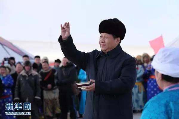 2014年春节前夕,习近平赴内蒙古调研。在锡林浩特市宝力根苏木(乡)冬季那达慕“五畜祈福”仪式上,习近平按照蒙古族习俗,用无名指蘸上银碗盛着的鲜牛奶弹了三下,祝福来年风调雨顺,五畜兴旺,人民幸福安康。