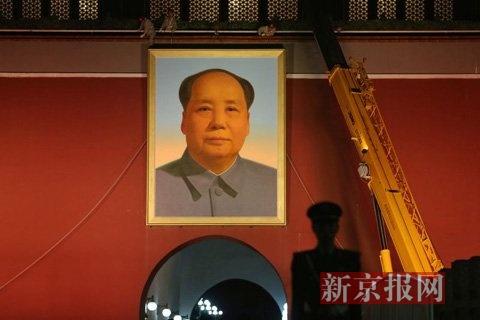 为迎接国庆67周年的到来,昨夜,天安门城楼毛主席像迎来了每年一次的“换新”工作。经过施工人员40分钟的操作,最新绘制而成的毛主席像悬挂在天安门城楼上。在聚光灯的照射下,新画像的颜色饱满亮丽。 昨夜22点40分,更换工作正式启动。此次更换,动用了两辆吊车和一辆货车。更换工作开始后,一辆吊车首先从天安门城楼的门洞中缓缓驶出,几名施工人员随即登上城楼,探身下到悬挂毛主席像的位置处,小心翼翼地将悬挂了一年的旧画像轻轻摘下,并用吊车吊离悬挂位置。 随后,吊车的吊臂再次缓缓抬起,稳稳地钩住停放在货车上的新画像的顶端,向天安门城楼的中央靠近。 几分钟后,新绘毛主席画像被悬挂在天安门城楼中央,23点23分,更换工作完成。整个换像过程持续了40多分钟。 新画像更换完毕后,一些仍在天安门城楼前游览的游客纷纷举起相机和新画像合影留念。 据了解,每年国庆节前夕,天安门城楼都要更换新的毛主席画像,被风吹日晒稍许褪色的旧画像则被取下。 等到了下一年,画家将会把旧画像进行处理,在处理后的画板上再精心画出毛主席的新画像,国庆前夕把上一年的旧画像更换下来。 北京青年报记者了解到,毛主席画像高6米、宽4.6米,加上框,总重量达1.5吨。 (责任编辑:北风) |