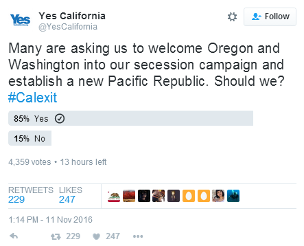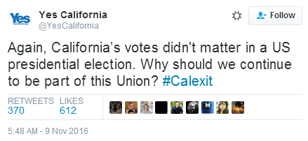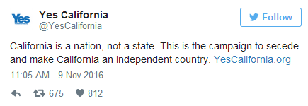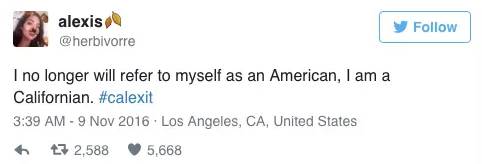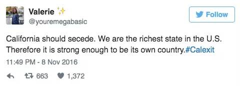 (LadyGaga到川普大厦前抗议) 抗议之外,加州人又动起了另外一个念头: 脱离美国独立成国! 外事儿(微信ID:xjb-waishier)发现,最近推特上已经掀起了一股呼吁加州独立的运动。 其实早在英国脱欧公投后,要求加州脱美的呼声就已存在,甚至效仿Brexit(英国脱欧公投运动的英文简写)做了个Calexit的标签。 不过当时响应者寥寥。