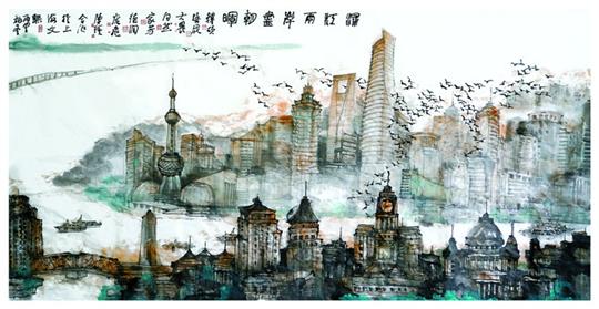 上海画家集体创作的《浦江两岸尽朝晖》。