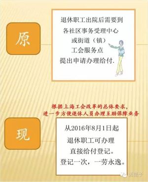 8月1日起,凡参加“退休住院保障计划”、有本市银行养老金账户的退休人员,愿意通过直接给付方式申领保障金的,可前往本市各社区事务受理服务中心或街镇工会服务点办理直接给付登记。市职保会将根据医保信息进行后台处理,将登记直接给付人员的保障金直接发放到养老金账户,市职保会还将通过手机短信告知退休职工保障金发放信息。