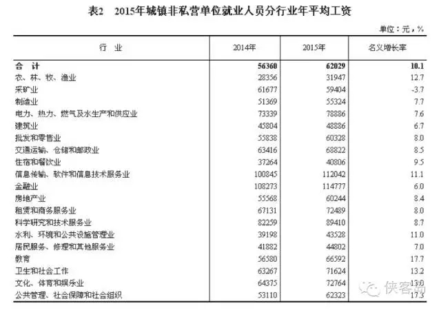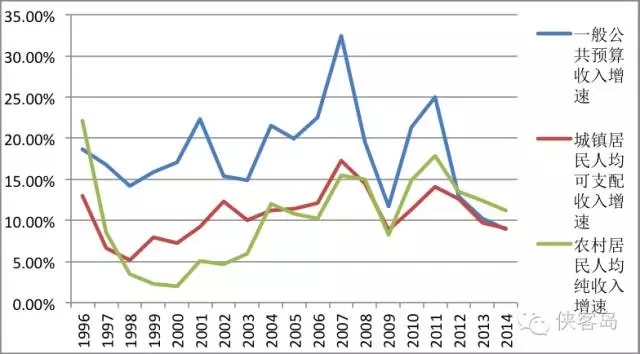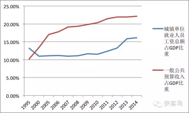 看完你会发现,2015年,就城镇非私营单位就业人员年平均工资而言,增速最低的地区中部(8.6%),比最高的西部(11.9%)低了3.3%;增速最低的行业采矿业(-3.7%),比最高的教育行业(17.7%),在2014年基数差别并不是太大的情况下,低了21.4%。同为辛辛苦苦工作的劳动者,工资差距咋就这么大呢?在此对负增长的采矿业抱以深深的同情。 但是,不是岛妹拉仇恨,为什么有的行业就能涨得又快又容易呢?看看信息传输、软件和信息技术服务业,在2014年基数已经破10万元的基础上,还涨了11.1%,这不是要逆天吗?还有金融业、科学研究和技术服务业,文化、体育和娱乐业…… 专家不是说工资增长应与经济增长和劳动生产率提高相匹配吗?去年的经济增速是6.9%,劳动生产率增长率增速是6.6%,那些远超两项指标的行业又是如何做到自带光环的? 这固然与当前互联网相关行业处于发展风口、一些行业固有优势较强等有关,但如果困难行业普通劳动者的工资福利水平还这么龟速地增长,对优势行业过快增长的工资水平不及时调整,只会让社会贫富分化更严重,埋下更多社会矛盾的引子。 没有对比就没有伤害。这边是大中城市房价高企,那边是高收入人群通过投资不动产等手段获得的财产性收入不断增加,对于增收渠道匮乏、每月只能眼巴巴指望一张工资卡的普通劳动者而言,还房贷、还信用卡、老人看病、孩子上学,哪一样不花钱?再看看工资单,更觉得增长成了龟速。 工资上涨为什么这么难? 其实岛妹也很纳闷,过去几十年,GDP的蛋糕越做越大,可为什么工资想涨得快点就这么难呢? 先来看看固有的分配体制。表1显示,1995年到2014年间,绝大部分年份,城镇单位就业人员工资总额占GDP比重远远低于一般公共预算收入占GDP比重,悬殊最大的2011年达9.08%,后者几乎是前者的两倍。 表2的3条线则更加明显,1996年到2004年的19年间,城乡居民收入在增速在大部分时候都没有跑赢一般公共预算收入增速。
