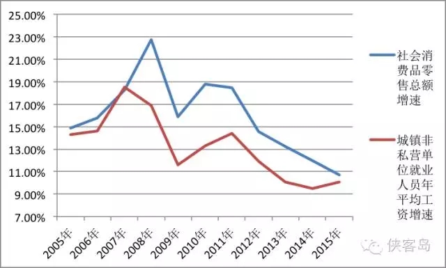 表2 数据来源:中国统计年鉴2015 看完是不是明白了什么? 国家要集中力量办大事可以理解,但发展经济说到底是为了改善民生,增加百姓福祉,既然国民经济的蛋糕越做越大,为什么只给财政多分,却不能给老百姓多分些?二者无论从比重还是增速来看,差距都如此之大,难免有与民夺利之嫌。可是想真的改革固有分配机制,涉及各方错综复杂的利益,比涨工资本身还要难得多。 把工资水平保持在较低水平恐怕还有另一层考虑。当初为了加速原始积累,劳动力被人为压低,形成了中国在国际市场中的竞争优势。为了继续保持这种优势,或者不让优势太快消失,工资也不能涨得太快。甚至有一些人主张,经济迈向新常态,需进一步压低劳动力成本才能避免中等收入陷阱。相关部门决策时是否受此影响,还真是不好说。 对于企业来说,当然也有难处,涨工资这件事,根本不是给员工工资卡上多打些钱就完事了,背后的隐性成本也要随之提高。按目前的社保费率计算,企业单在员工的五险一金缴费费率就超过35%。给员工每多涨点工资,就要多缴纳一大笔社保费。 想提振消费,没钱你怎么花? 也有人要问,说工资涨得慢,为什么这几年消费还这么火爆,甚至成为拉动经济增长传统“三驾马车”中硕果仅存的一辆?这个双十一大家不还在疯狂剁手吗? 岛妹觉得,双十一的火爆,既有商家制造出的需求刺激,也因为一些力度较大的折扣优惠,使平时惜购的需求集中爆发。 至于消费火爆,其实也不尽然,看看下图中的社会消费品零售总额增速便一目了然。更重要的是,这一增速与城镇非私营单位就业人员年均工资增速趋势几乎吻合,呈现了很高的相关性,可以说,工资增速的下降,已经对消费造成了明显的影响。