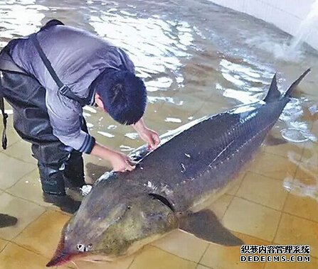 图为50多岁、重达700斤的雌性野生鳇鱼 抚远县鲑鱼放流站站长:下一步一个是尽快地把水温提上来,让它尽快地吃上食,饵料吃上它的伤口会愈合得快一些,通过人工进行缝合消毒处理,应该能达到一个很好的效果。 解说:在工作人员的精心照顾下,现在它的体力正在逐渐的恢复当中,待其体力达到最佳状态时,工作人员就会对他进行人工催产,培育小鱼苗进行放流。据预测这条鳇鱼大约可以产卵150万粒,按照80%的成活率来计算,也可以为鳇鱼家族繁育120万尾后代。 据了解为了保护这一濒危物种,当地水产部门已经连续多年进行史氏鲟、达氏鳇以及鲟鳇鱼的人工孵化和增殖放流,扩大野生环境内鲟鳇鱼的种群数量,今年春渔期以来,抚远县已经捕捞到400斤以上的鳇鱼6条,200到300斤的鲟鳇鱼更是十分多见。 扩展阅读 鳇鱼,也称鲟鳇鱼,学名达氏鳇,是白垩纪时期保存下来的古生物,曾与恐龙在地球上共同生活,有水中活化石之称,是我国淡水鱼类中体重最大的鱼类,主要分布于黑龙江及与其较大支流相连的湖泊。抚远是达氏鳇的主要产地,历史上曾捕捞到2000多斤的鳇鱼,由于水质的变化和过度捕捞等原因,野生鳇鱼的数量非常稀少,特别是500多斤以上的鳇鱼更是难得一见。 |