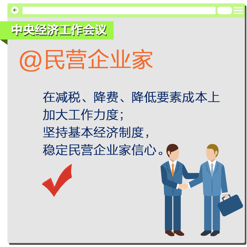 【红包】要坚持“房子是用来住的、不是用来炒的”的定位,既抑制房地产泡沫,又防止出现大起大落。要在宏观上管住货币,微观信贷政策要支持合理自住购房,严格限制信贷流向投资投机性购房。 【解读】2016年,中国楼市再次经历了从升温到狂飙,再到政策收紧的过程。这期间,开发商捂盘惜售、哄抬房价,中介商炒作房价、虚报房源等乱象层出,严重损害了购房者,特别是刚需购房者的切身利益。 “房子是用来住的,不是用来炒的”,中央经济工作会议明确楼市定位,就是要传达一个信号——不鼓励炒房。信贷闸门关紧,则相当于给炒房的投机客“断粮”。作为刚需购房者的你,有望不再被“炒房者”牵着鼻子走。 2、民营企业家