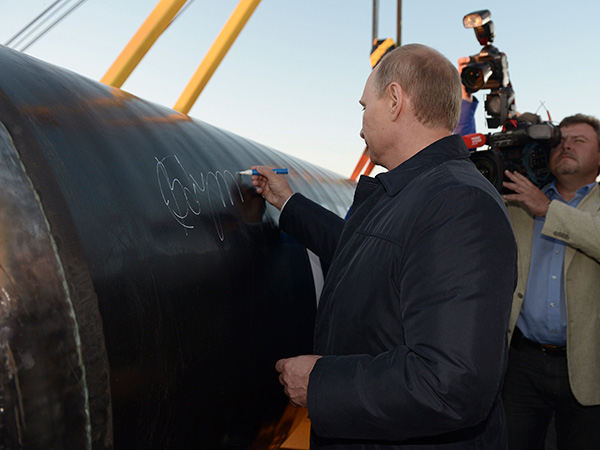 资料图:俄总统普京在输往中国的天然气管道上题字