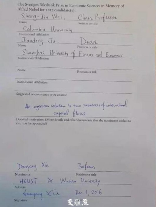 交汇点记者19日晚从多方确认,南通如皋籍经济学家鞠建东被提名诺贝尔经济学奖。![]() 1978年,15岁的鞠建东考入南京大学 ![]() 香港科技大学、武汉大学谢丹阳教授提名鞠建东 鞠建东于1963年出生于南通如皋,为清华大学经管学院经济系教授,清华大学国际经济研究中心主任,上海财经大学国际工商管理学院教授,教育部长江学者特聘教授。现任上海财经大学国际工商管理学院院长。 鞠建东15岁考入南京大学数学系,22岁考入清华攻读经济学硕士,27岁赴美留学直至成为美国俄克拉荷马大学的终身教授。 鞠建东在美国学习工作了25年,却一直没有加入美国国籍。他经常说:总有一天,我还是要回国,要为国家做事。2014年,鞠建东辞去美国的终身教职同时回国,担任上海财经大学国际工商管理学院院长。 鞠建东创造性地将宏观国际经济学中的动态跨期模型和微观国际经济学中的结构分析模型相结合,建立动态结构分析方法,并将之应用到国际收支理论(与哥伦比亚大学魏尚进教授、香港中文大学施康教授等合作),提出新兴国家(比如中国)的国际收支顺差是发达国家和新兴国家之间经济结构差别的均衡现象;将之应用到产业动态结构理论(与世界银行林毅夫教授、香港科技大学王勇教授等合作),提出产业升级与经济结构调整的动态模型。 此外,鞠建东提出通过贸易改革提高社会福利的充分必要条件(和宾州大学Krishna教授合作)。在各国通用的Feenstra教授所著的国际贸易研究生教材中,这个条件被称之为“Ju-Krishna定理”。 获得诺贝尔经济学奖提名是拿到诺贝尔奖第一步。据知情人士透露,每年有大约1000至2000名左右的全球知名人士有提名权,在12月份开始进行提名,提名鞠建东的为香港科技大学、武汉大学谢丹阳教授。 交汇点记者从如皋市委宣传部获悉,鞠建东本人非常低调,起初是在如皋老家的亲友群内发布了相关信息。“提名诺奖在如皋本地是一件大事,目前还没有如皋人获得过提名。”一位如皋市委宣传部工作人员告诉记者,如皋本地百姓获悉以后,一传十,十传百,将这个消息传播开来,如皋当地也和鞠建东本人进行了沟通联系,确认了消息的真实性。 (责任编辑:日升) |