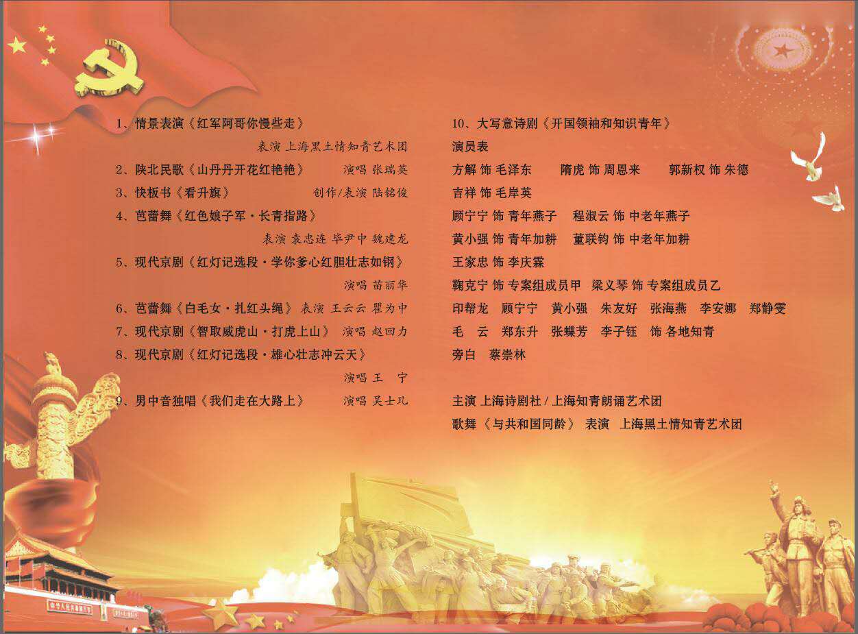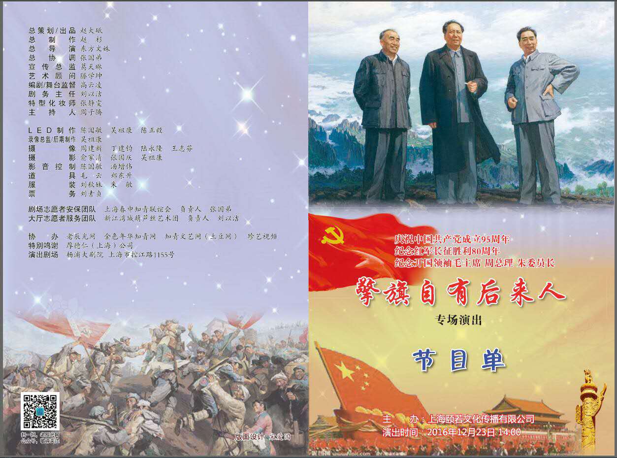 ![]() 2016年庆祝中国共产党建党95周年 纪念红军长征胜利80周年 纪念开国领袖毛主席 周总理 朱委员长 《擎旗自有后来人》 专场演出节目单 ![]() ![]() 1情景表演《红军阿哥你慢些走》 上海黑土情知青艺术团 ![]() 2陕北民歌《山丹丹开花红艳艳》 《南泥湾》 演唱 张瑞英 ![]() 3快板书《看升旗》 创作/ 表演 陆铭俊 ![]() 4 芭蕾舞《红色娘子军·长青指路》 表演 袁忠连 毕尹中 魏建龙 ![]() 5现代京剧《红灯记选段· 学你爹心红胆壮志如钢》 演唱 苗丽华 ![]() 6芭蕾舞《白毛女·扎红头绳》 表演 王云云 瞿为中 ![]() 7 现代京剧《智取威虎山·打虎上山》《送别》 演唱 赵回力 ![]() 8男中音独唱《我们走在大路上》 ![]() 《中国 中国 鲜红的太阳永不落》 《大板城的姑娘》 演唱 吴士玌 9大写意诗剧《开国领袖与知识青年》![]() ![]() 演员表方解饰毛泽东 隋虎饰周恩来 郭新权饰朱德吉祥饰毛岸英 顾宁宁饰青年燕子 程淑云饰中 老年燕子 黄小强饰青年加耕 董联钧饰中 老年加耕 专案组成员: 毛云饰演甲 乙 郑东升饰演乙 梁义琴饰丙 旁白 蔡崇林 王家忠饰李 庆 霖 各地知青演员 知青1 印帮龙 知青2 顾宁宁 知青3黄小强 知青4 朱友好 知青5 张海燕 知青6 李安娜 知青7 郑静雯 知青8 鞠克宁 知青9 沈芬英 ![]() 主演 上海诗剧社 群演 上海知青朗诵艺术团 歌舞 《红军阿哥你慢些走》《与共和国同龄》 上海黑土情知青艺术团 总策划出品 赵大砥 总 制 作 赵 杉 总 导 演 东方文姝 总 协 调 张国弟 宣传总监 葛天琳 话剧导演 滕学坤 编剧/舞台监督 高云凌 剧务主任 刘以洁 主持人 周子腾 LED制作 陈国敏 吴祖康 陈正毅 后期制作 吴祖康 摄影 俞家清 摄像 陈国敏 丁建钧 陆永隆 周建新 影音控制 吴祖康 票 务 刘素贞 舞台剧务 刘秋妹 李安娜 朱敏 服装道具剧务 张蝶芳 李子钰 朱友好 郑静雯 吴佩珍 马世玲 剧场安保志愿者团队 上海春申知青联谊会 负责人 张国弟 大厅服务志愿者团队 新江湾城葫芦丝艺术团 负责人 刘以洁 主办 上海颐若文化传播有限公司 协办 老辰光网 金色年华知青网 知青文艺网 土豆网珍艺视频 特别鸣谢 厚德仁(上海)公司 演出时间 2016年12月23日下午14:00 演出剧场 杨浦区控江路1155号杨浦大剧院 (责任编辑:晓歌) |