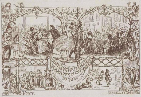 直到19世纪中下叶的时候,还没有什么人过圣诞节——至少,不是以我们现在所熟知的方式。许多商户甚至不把它作为一个节日。送礼是新年的习俗,但随着圣诞节在维多利亚时代变得越来越重要,这一点才有所改变。19世纪末,圣诞节一跃成为英国人年历上最重要的庆典日,而维多利亚时代在科技、工业以及公共设施的全方位发展,都使得圣诞节成为一个能让更多英国人享受的节日。其中最显著的一个诞生自维多利亚时代的圣诞习俗就是圣诞卡片。V&A博物馆自建馆以来就对收集和展示贺年卡片有特别的兴趣,其收藏的超过3万种各式卡片里,逾一半是圣诞卡。而首位馆长亨利·柯尔爵士就是将圣诞卡片引入英国的第一人。1843年,他委托艺术家约翰·卡尔葛·荷斯利(J.C. Horsley)为他的贺年卡片设计一个喜庆的场景。 ![]()