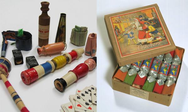 圣诞拉炮的包装盒以及拉炮中的小玩意儿,1948年。