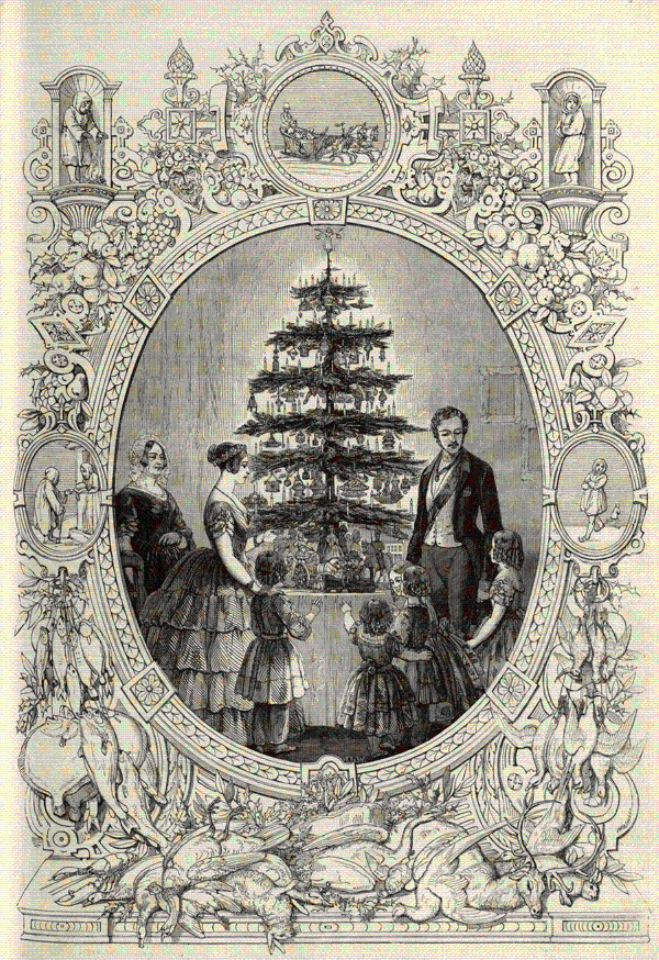 在室内装饰圣诞树的风俗来自阿尔伯特的出生地德国。1848年,《伦敦新闻画报》(Illustrated London News)刊发了一幅画,画面上女王一家围绕着一棵装饰华美的树旁庆祝。于是装饰圣诞树这一行为迅速传播开来,人们开始在室内为树装点各种鲜艳的颜色和亮闪闪的物质。