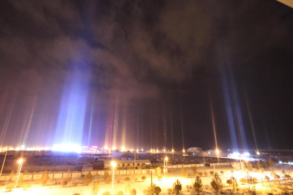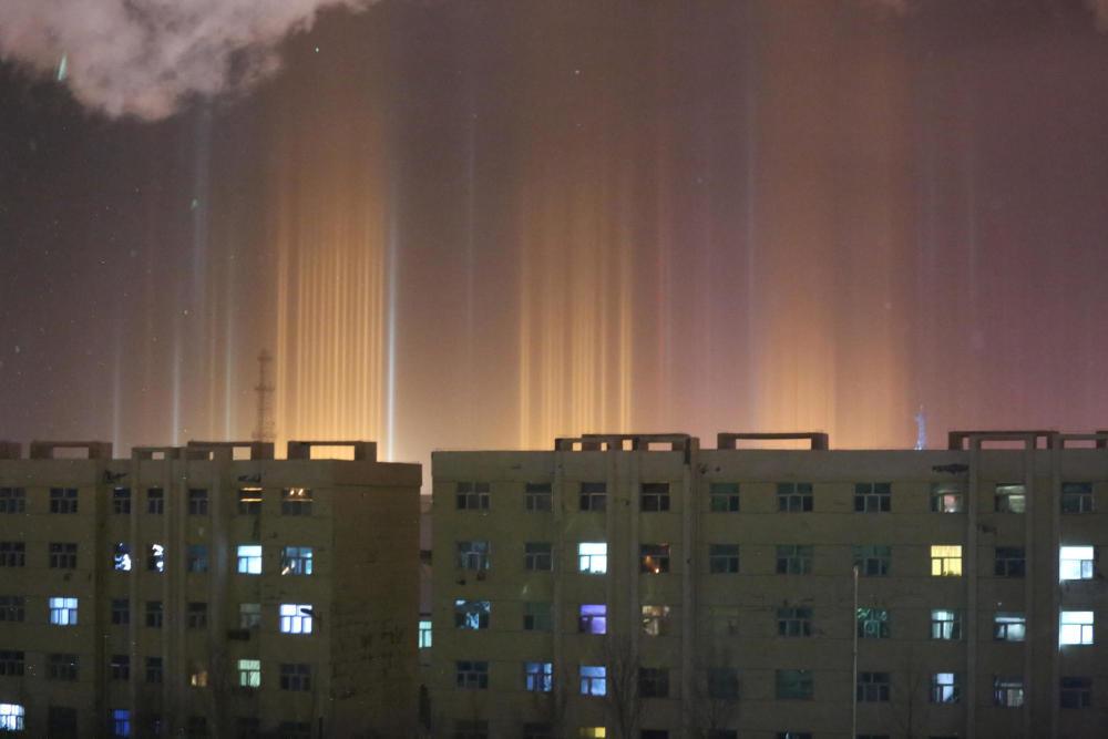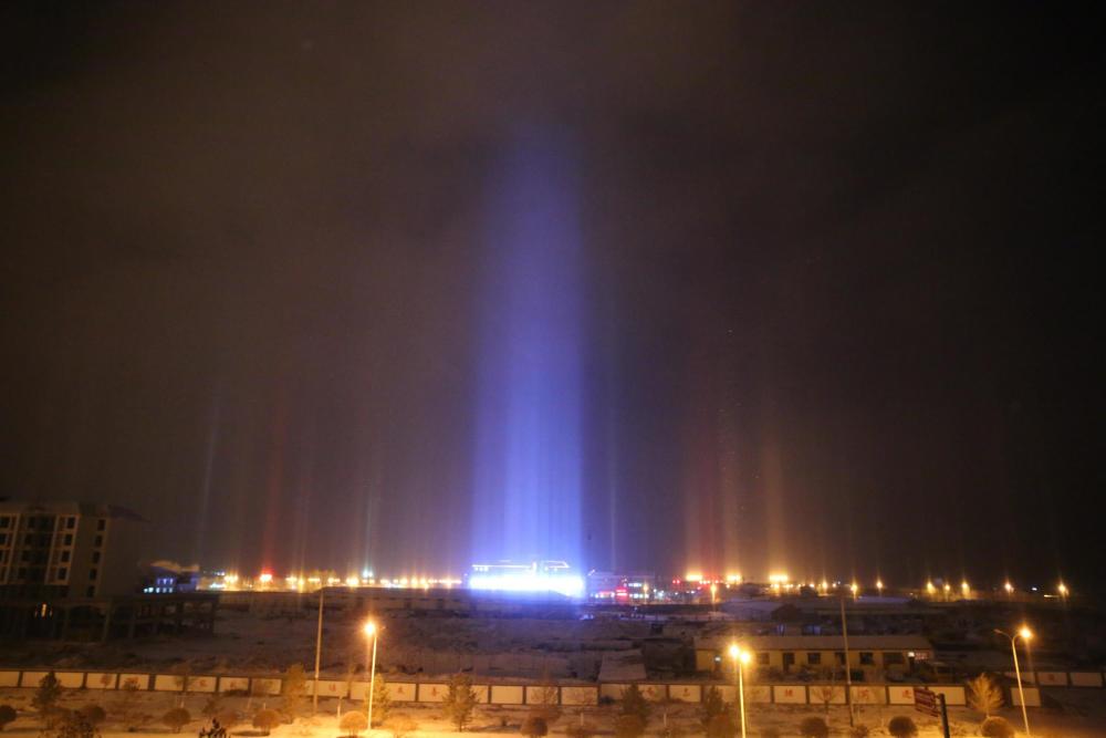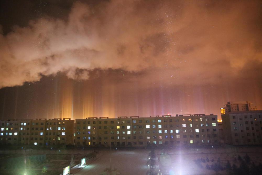 ![]() ![]() ![]() ![]() ![]() 童话小镇!内蒙古自治区锡林郭勒盟出现的日柱现象 12月26日,内蒙古自治区锡林郭勒盟出现日柱现象,“日柱”现象从晚间19时30分出现,持续至21时30分,当时室外气温为零下20摄氏度,天晴无风,十分利于市民观测。建筑物的照明灯光被反射成一道道色彩斑斓的光柱,把城市夜空点缀得如梦如幻,使人如同置身于“童话小镇”。 当冰从高层的云落下时,有时会形成平板,形状就像是一些冰晶。空气阻力使得这些冰晶在落到地面时,几乎是水平的,此时日光也从地平线附近射来,被冰晶反射的阳光因此几乎完全是垂直的,产生日柱效应。当天气很冷而太阳正好升起或落下时,落下的冰晶会反射阳光并产生一道罕见的光柱。