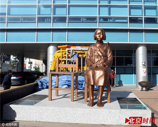 当地时间2016年12月30日,一尊慰安妇铜像被重新放置在日本驻釜山总领馆前。