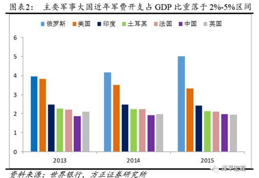 导读:中央设立军民融合发展委员会,军民融合不仅有利于国防建设,也有利于经济发展。军工还是中央经济工作会议确定的七大重点混改行业,军民融合作为军改重要方向,有望加速推进。 中国的经济增长、工业实力提升和军工技术获突破支撑军事建设加速。纵向看,国防支出年化增长率落后于同期GDP, 1952-2015年期间,国防支出年平均增长率仅8.22%,同时期GDP的年平均增长率11.42%;横向看,中国的军费支出在大国中也排名靠后,按财政部口径,中国2015年国防支出占GDP比重仅1.32%,远低于军事大国应达的最少2%。当前,中国已成长为制造业第一大国,企业门类齐全,良好的工业基础为军工的加速发展提供了保障。近年来,中国在海、空军一些领域技术上取得实质性突破,为新装备的批量生产打下基础,而地缘局势趋紧,进一步推动海、空军新装备的生产列装。 关键技术领域仍存在瓶颈。“航空发动机与燃气轮机”技术相对海空军先进作战平台的落后就是典型的技术瓶颈。技术的积累与工业实力的提升使我们有能力在军工技术上取得进一步突破,然而要进一步提高生产研发效率,需推动军民融合,引入民资进入生产研发体系,提高效率。 军工混改激发企业活力,军民融合提升经济效益。第一、军工混改是今年国企改革的排头兵,有利于激发国企活力,对垄断的打破也可以有力提高民企的积极性,提高企业效率。第二、以DARPA模式为典型的项目竞争模式,可以利用市场力量集中智力资源激发创新,在尖端技术领域研发风险与收益的权衡中找到平衡。第三、军民融合可以从技术溢出、产业集群和规模效应三个方面提高经济效益。 军民融合是未来发展战略,三大领域有望取得重大突破。一是军转民,北斗卫星的商业化运作,其市场规模巨大,应用前景广阔。二是民参军,民用大飞机的研制将加速,除商业化用途外,民用大飞机为军用特种机的研制奠定基础。三是军民协同,中国造船业规模巨大,规模效应降低了军舰的建造成本,军民协同的推进也可以改善民营造船业当前面临的不利境况。 正文 1 经济实力与军事实力紧密相联 1.1 军事和经济协同发展,军事投入应适当 经济发展为军事建设奠定经济、技术和人力基础,军事建设成果带来的安全保障、技术外溢和经济拉动效果也促进了经济发展,二者紧密相联,并行发展,从世界范围内看,军事建设获得突出成果的国家其经济发展也较好。 从美国国防支出的历史维度来看,冷战结束后,美国防务负担与竞争压力减小,进入“战略间歇期”,国防支出也随之常态化,美国国防支出占GDP比重相对平稳,经济总量的增加带来了国防支出的平衡增加。 从全球来看,军事投入应适当。一方面,过高的国防建设支出会对其他经济发展领域产生挤出效应,从而影响国家的经济发展速度。另一方面,由于国防工业是一种公共产品,一定的国防开支有助于保障国土安全,另外一定规模的国防支出有助于经济的增长。根据当前学界的测算,和平时期国防支出占GDP不宜高于GDP的15%。考虑到当前军队建设是以现代化、信息化为目标,体现为军事技术装备更新换代的高投入、高消耗,这就要求国防建设有关的支出不能过低,应该确保在GDP的1%以上,大国军费开支则需维持在2%以上。 国际主要军事大国的数据与学界测算基本相符。Global Firepower评定的2015年军事实力前十的国家中,除了第二次世界大战战败国德国、意大利、日本由于不同程度的制裁,近10年军费支出处于占GDP比重1%-2%区间,其他国家近10年军费支出落于占GDP比重2%-5%区间。其中俄罗斯军费开支占GDP比重较高,2015年高达5.01%,美国则为3.32%。 图片1.2 军工技术的进步以工业能力的进步为基础 军工技术的突破依赖于工业基础的提升,工业的发展与民用技术的提高是军事技术取得突破的必要条件。美苏军备竞赛时期,苏联在航空航天、喷气式飞机、核武器等诸多军事前沿科技领域取得了突破性发展,与其工业基础的迅速增强是分不开的。根据《苏联基本数字手册》,1980年苏联钢产量达到美国143%,发电量达52%,石油产量达140%,拖拉机、纺织品等产量均远超同期美国。虽然苏联在工业品品类上以及轻工业产量上与美国有较大差距,导致苏联的后继乏力,但重工业的发展为苏联军事技术的进步奠定了坚实的基础。 2 中国军事建设加速,军工体系需变革 2.1 中国军事发展总体滞后于经济建设但近年来有所加快 中国国防建设滞后于经济建设。国防支出从1950年的28.01亿元增长到2015年的9087.84亿元,增长了323.45倍。1990年前,国防支出总额增长不明显,直到1990年左右,伴随着经济的快速成长和海湾战争的刺激,中国的国防建设逐步加速,国防支出总量开始有明显增长,但占GDP的比重仍不高。根据瑞典斯德哥尔摩国际和平研究所统计,中国国防支出总额从2009年开始位居全球第二位,军事实力排名根据Global Firepower的数据统计仅落后于美国与俄罗斯。虽然中国的军事能力有了翻天覆地的改变,但据测算,使用经济核算中资本积累模型方法时,1952-2015年期间,中国国防支出年平均增长率仅8.22%,大大落后于同时期GDP的年平均增长率11.42%。 图片横向来看,中国军费支出占比在大国中排名靠后。按世界银行口径,在军事实力前十的国家中,除掉受一定限制的二战战败国,中国军费支出占比仅略高于英国。按中国财政部口径,中国2015年国防支出占GDP比重仅1.32%,远