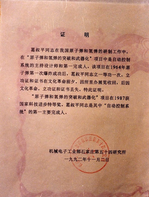 ![]() 怀 念 父 亲 ——我国国防科研的老专家葛叔平(3) 1966年夏,近乎疯狂的“文革”,冲击了社会的正常秩序,到处批判“走资本主义道路的当权派”、“资产阶级反动学术权威”,紧接着就开始了抄家、游斗,社会一片混乱,所有学校都停课了。一天,正在校园里看大字报的我,被学校传达室的工友叫去接父亲打来的电话。他说,他在北京开会,母亲到保定看望生病的姨妈去了,石家庄家里只有刚参加工作,在工厂学徒的大弟弟(17岁)和小学刚毕业的小弟弟(13岁)了,因为怕他们到社会上去跟着别人胡闹,让我回去一趟。 回到家里,刚参加工作不久的大弟弟就告诉我:前几天,因为上夜班,他正在家里睡觉,研究所的几个“造反派”跑到我们家,强行把家里电话给拆了。他和他们吵了起来,告诉那些人:电话是“总参”让给我父亲装的,你们今天拆了,明天就得给装上!没过两天,他们灰溜溜地又回来给装上了。一种父亲将受到冲击的不祥预感浮上我的心头,我觉得可能是因为父亲当时还在承担的国防科研项目,延迟了对他冲击的时间。 1967年秋,在石家庄小学刚毕业的小弟弟,突然出现在我就读的北京师院附中校园内。我问他来北京干什么?他说在石家庄父母哪里也不让他去,他就自己坐火车跑到北京来参加“文化大革命”了。当天晚上,母亲就从石家庄打来电话,问小弟弟是否在我这里,知道他在我这里后,她说,小弟弟是借着买酱油的机会,拿钱买了火车票偷偷来北京的。并告诉我,父亲在北京开会,会让父亲接他回去的。过了两天,父亲将弟弟接走了。 “文革”结束后,我问父亲:1966年夏,1967秋,那么乱,你去北京干什么?他说,1966年夏那次,是钱学森让他去商量成立“宇宙航行院”的事情;1967年秋那次他去北京,是参加由国防科委副主任钱学森主持的国防科委在北京召开的尖兵一号卫星的大总体协调会,并且看到了周总理对成立“宇宙航行院”报告的批示:“地上的事情忙不过来,天上的事情先放一放”。 1968年初夏,因为我从“文革”一开始就在学校反对“造反派”殴打老师,欺负同学,破坏公共财产的行为,被学校的“造反派”打伤,回到石家庄养病。这次养伤期间,我发现部队研究所大院里,给父亲贴了不少“大字报”。说他是“日本汉奸”,“国民党特务”,“资产阶级反动学术权威”……。看后,我第一次郑重其事地问父亲:“外面贴了你不少大字报,是怎么回事?你有历史问题吗?” 他说:“你们放心,我没有任何历史问题,‘总政’早就调查清楚了。如果有问题,可能让我负责那么多国防尖端的绝密科研工作,进入核试验基地和导弹基地吗?” “任何技术问题最后总要有人拍板吧,国防部,国防科委对我的任命,就是要我在技术上拍板、负责的,没有权威,工作就没法进行。” “至于是不是‘反动’,那看你干的什么,总不能说为了国家的国防事业完成科研任务就‘反动’吧?” 一天晚上,刚吃完晚饭,研究所的一帮“造反派”冲进我家,开始抄家。我们兄弟被和父母隔开在不同的房间里。我坐在沙发上,问看管我们的几个叔叔、阿姨,父亲有什么问题?得到的回答是,他们也不知道。当晚父亲就被他们带走了。在收拾被“造反派”搞得乱七八糟、一片狼藉的房间时,我第一次看到第一次核试验成功后周总理给父亲的请柬,国防部长签署,任命父亲担任研究所总工程师的任命书和国防科委任命他担任我军首个“侦察干扰”(电子对抗)室主任的任命书。第二天“造反派”勒令我们全家晚上到部队俱乐部大礼堂参加批斗会。我们看到父亲和研究所所长、政委等所领导被揪到礼堂的舞台上,挂着牌子被粗暴的按着头进行批斗。后来几天,我们看见父亲在扫马路,想和他说话时,他摆手,不让我们接近他。 “爸爸到底有没有历史问题?”我问母亲。 母亲对我们说:“我不相信你们的父亲有历史问题。上海解放前夕,国民党反动派为了破坏新中国的建设,企图不给新中国留下任何技术干部,两次逼迫你们父亲离开大陆。他听从上海地下党组织的安排和指导,坚持不离开大陆。第一次,反动当局要我们全家去台湾,他按照地下党的指示,以你们奶奶生病,要回老家探病为由进行拖延。第二次,两个特务上门,把机票拍在桌上要你们父亲去香港,并掏出手枪,不断恐吓、逼迫。他根据地下党的安排,事先用钱买了一个假证明,说我即将要生你大弟弟,等孩子生了就走。而实际上我们根据地下党的布置,马上搬家,离开了原住处。上海5月份一解放,地下党就找你们父亲出去到华东空军工作了。要是有问题,怎么可能这么快就到部队工作呢?” 她还告诉我们,刚解放时,为了尽快恢复国民经济建设,父亲还自己主动降了二级工资。 我也觉得,从我记事开始,虽然始终不知道父亲在从事什么具体工作,但是知道父亲在搞国防科研,而且是保密工作。“总参”这么信任他,父亲不会有什么问题。这次从大院里贴的大字报中的字里行间,也隐隐约约地感到父亲参加了第一次核试验。 1968年12月,我从北京插队走前,母亲从石家庄来北京给我准备行装。我向母亲询问父亲的情况,母亲说她也不清楚,研究所的“造反派”只是让她给父亲送过一两次替换的衣物。据母亲讲,我离家回北京后,又抄了我们家几次,寻找父亲的“反革命证据”,但是,什么也没找到。后来,小弟弟告诉我,“文革”中造反派一共抄了我们家7次。 “文革”后期,我问父亲那时的