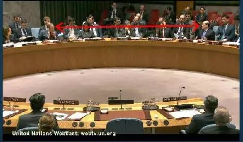 ▲发言稿上似乎有临时写稿的痕迹。 在最后的十几秒中,刘结一索性完全脱稿:“有关国家应当深刻反思,中东和叙利亚是怎样走到今天的局面的?不同国家又扮演了什么角色?哪些是光彩的、哪些是不光彩的?只把‘人民’挂在口头上,是极其虚伪的。” 在中国代表的发言全程中,英国代表里克罗夫特时常用手托着下巴,似乎若有所思。而刘结一发言完毕后,他与里克罗夫特四目相对(如下图),有没有感受到现场的“火药味”?