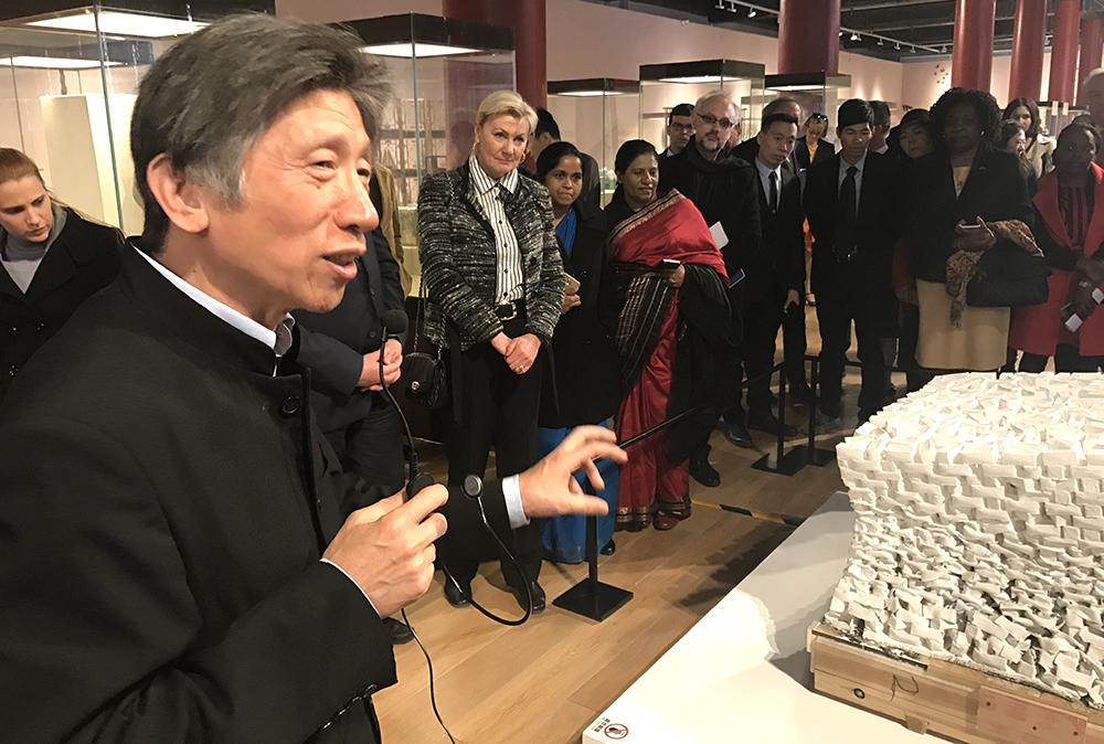 央美院长范迪安正在向外交使节介绍方力钧陶瓷作品《2014》。