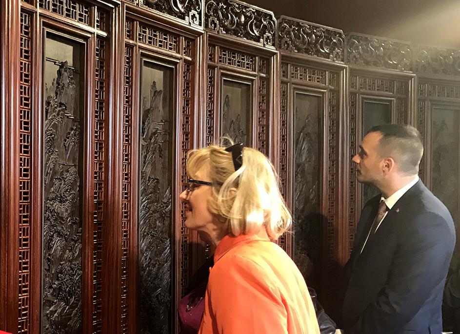 外国使节们在当代东阳木雕杰作《古山水画十二扇屏风》前认真观看。