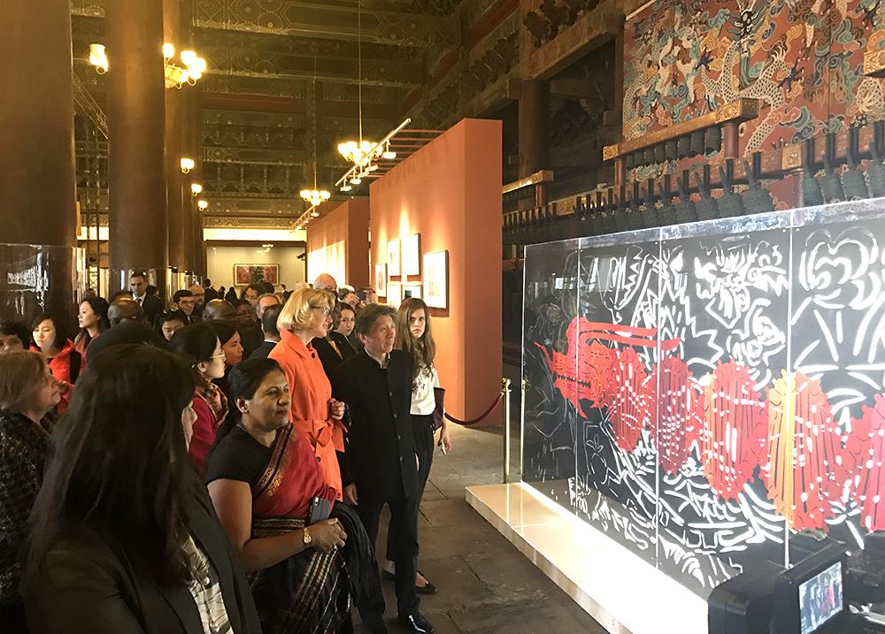 与那些古代器物相对应,中国当代艺术家的作品也呈现独特魅力。朱炳江30平方米的青铜作品《宋画迷宫》,傅中望以一段段木料通过榫卯连接起来的《随方就圆》、方力钧的陶瓷作品《2014》、黄春茂的釉下彩强化瓷作品《G20夫人宴会用瓷》、卢光正的大型阴沉木和金丝楠木作品《古山水画十二扇弧形屏风》、吕胜中的2.3米长巨幅剪纸《太平安》、吕越以夹缬手法创作的极具时尚感服装《蝴蝶夫人》、张德峰的景泰蓝作品《好山好水好地方》、吕品昌的刚玉瓷作品《金砖》等,都让人感到物材之美、形象之美和技艺之美。展览中参与人数最多的,恐怕就是由30多位画家共同绘制的、取材于山西大同市善化寺壁画的《帝释天梵天图》。在这件39米×5米的巨幅壁画上,十大明王、二十诸天护法、十二元辰、十二圆觉菩萨栩栩如生,线条与色彩展示着千年以降的中国寺观壁画系统与当代壁画创作的平滑连接。驻华使节们一边参观一边询问,所提问题五花八门,大家沉静在清雅的文化交流氛围中。 ![]()