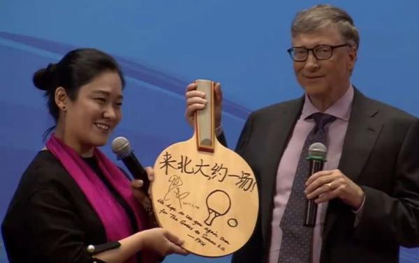 比尔·盖茨在北大获赠乒乓球拍。