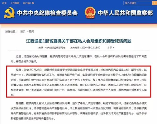 △《中国青年报》2011年报道截图 此外,政知局(微信ID:bqzhengzhiju)在2014年的公开报道中看到,郑东平的职务是陕西省纪委执法和效能监督室主任。2016年4月的公开报道中,郑东平已担任陕西省纪委驻省委办公厅纪检组组长。 纪检组长被问责并不鲜见 说到这里,政知局(微信ID:bqzhengzhiju)又想到一个轰动一时的“一顿饭丢了乌纱帽”的纪检干部。 2016年7月27日,原赣州市定南县委书记陈阳霞被提拔为副厅级干部,7月下旬到江西省纪委报到上班(试用期一年),担任党风政风监督室主任。江西省委组织部干部教育处处长程子亮8月4日晚请陈阳霞吃饭,并邀请曾一起在国外参加培训的省直机关另外两名干部参加。程子亮与江西省旅游集团副总经理黎友才商议后将聚餐地点确定在了一个私企老板的会所内,黎还提供了晚餐红酒。 此事不久被举报,8月12日,江西省纪委经过调查后迅速作出了处理:给予陈阳霞党内严重警告处分,终止其省纪委副厅长级室主任试用期,调离省纪委机关,而此时距她上任不到一个月。