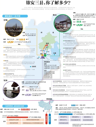 雄安三县,你了解多少 日前,中共中央、国务院印发通知,决定设立河北雄安新区。这是继深圳经济特区和上海浦东新区之后又一具有全国意义的新区。对于这个距离北京百公里外的新区,你了解多少? 雄安新区三县介绍 容城 位置距北京、天津均为120公里,距保定50公里 面积314平方公里 人口26万 经济2016年全县生产总值59.4亿元 特色 中国男装名城 2006年,容城被评为“中国男装名城”和全国纺织产业集群试点。与浙江义乌、诸暨并称全国三大衬衫生产基地,行业内素有“南石狮、北容城”之誉。2015年服装业完成产值246.5亿元。 白沟 具有丰富的市场资源,紧邻北京周边最大的小商品集散地——白沟,对容城商贸物流和加工业具有很强的拉动作用。 地热田 具有丰富的地热资源,地处中国东部中低温地热田,具有储量大、可回灌等重要特点,是华北地区具有代表性的地热田,拥有休闲旅游产业的良好发展基础。 白洋淀 具有丰富的旅游资源,紧邻华北地区最大的湿地——白洋淀,境内有近万亩水域。 箱包毛绒玩具产业 毛绒玩具产业蓬勃发展,全县加工户达到1170家,从业人员1万余人,箱包产品出口20多个国家和地区。 雄县 位置北距北京108公里,东距天津100公里,西南距保定70公里,南倚华北明珠——白洋淀,北靠“中国北方购物天堂”——白沟。 面积524平方公里 人口约38万 经济2016年全县生产总值101.14亿元 特色 中国温泉之乡 地热田面积320平方公里,地热水储量821.78亿立方米,具有埋藏浅、储量大、水温高、水质优的特点,2010年被国土资源部命名为“中国温泉之乡”。 中国古地道文化之乡 历史文化悠久,有长达65公里的宋辽古战道,被誉为“地下长城”,有著名的杨六郎镇守的瓦桥关遗址。2007年,被命名为“中国古地道文化之乡”、“中国古地道文化研究中心”。 中国塑料包装产业基地 雄县民营经济发达,形成了塑料包装、压延制革、乳胶制品、电器电缆四大支柱产业。塑料包装行业,与广东奄埠、浙江龙港并称全国三大塑料软包装基地,2008年被命名为“中国塑料包装产业基地”。 中国仿古石雕文化之乡 雄县仿古石雕源于宋辽边境贸易,在明代中期形成仿古产品市场,一直延续至今。在以仿古石雕为主的基础上,又发展到仿古瓷器、木雕、竹雕、角雕、铸铜、古砚等仿古领域,年产值达3.5亿元。 北方最大古玩交易市场 古玩收藏交易有500多年历史,建有北方最大古玩交易市场。 乳胶行业发达 雄县大步村是中国气球第一村,产品占全国市场份额的80%以上;医用手套填补了河北省空白;雄县安琪胶业有限公司是北方最大的安全套生产企业,年产量12亿只,是国家计生委定点采购企业。 安新 位置北距首都北京162公里,西距保定市45公里,西南距省会石家庄187公里。 面积738.6平方公里 人口39.3万(有汉、满、蒙、回、壮等15个民族) 经济2016年前三季度全县生产总值40.01亿元 特色 白洋淀旅游胜地安新县是中国北方著名的旅游胜地。东有华北平原最大的淡水湖泊白洋淀。白洋淀总面积366平方公里,安新境内面积312平方公里,约占85%。 华北最大鞋业生产基地制鞋业,素有“南温州、北安新”之说,目前安新已成为华北地区最大的鞋业生产基地。 华北最大羽绒集散地安新被河北省政府确定为羽绒生产基地,也是华北地区最大的羽绒集散地,培育了一批国优和省级名牌企业。 华北最大废旧有色金属集散地有色金属加工业,安新县形成了集回收、电解、线缆加工、精密仪器制造于一体的完整产业链,成为华北最大的废旧有色金属集散地。 雄安新区 面积 起步区:约100平方公里 中期发展区:约200平方公里 远期控制区:约2000平方公里 定位 绿色生态宜居新城区 创新驱动发展引领区 协调发展示范区 开放发展先行区