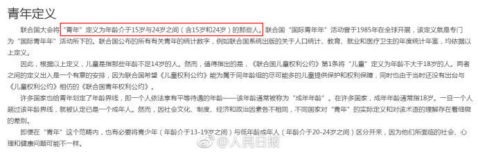 据联合国官网,联合国大会将“青年”定义为年龄介于15岁与24岁之间(含15岁和24岁)的那些人。