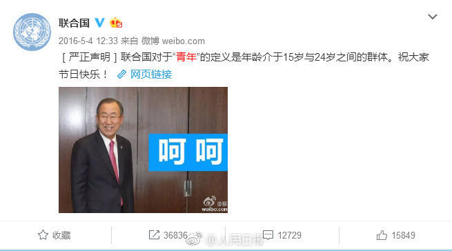 感觉到93年出生的松了口气,明年不用当中年人了…… 网友评论: 我是一个蠢蠢的逗比:到底听中央的还是听联合国的?? 逗比达哥学摄影:我当然是相信我们中央的了 等着收信的汉子:所以五四青年节,要放我半天假么? 酸奶罐儿1916:联合国:竟被打脸 山野小老头:我觉得中央的这个定义要比联合国的那个靠谱科学得多 追剧二猫子:我一直都觉得我是宝宝 【相关阅读】 还停留在“88年的中年女子”? 联合国定义,92年生的已是中年