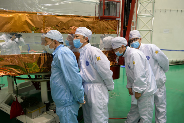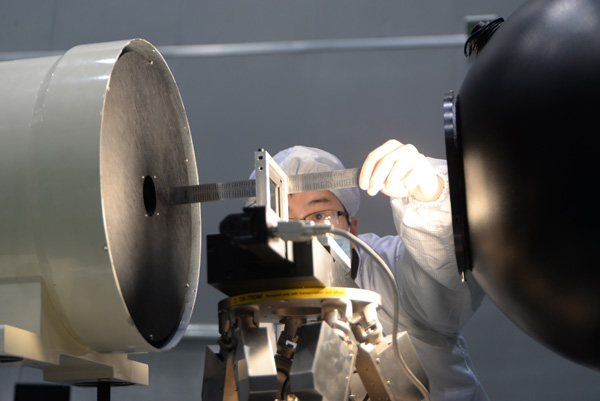 卫星研制人员在测量试验设备。