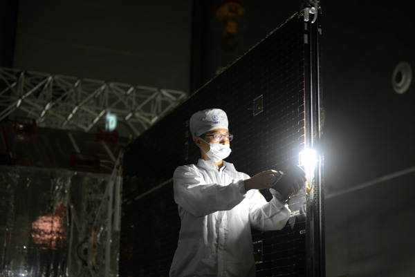 研制人员对卫星太阳帆板做测试。