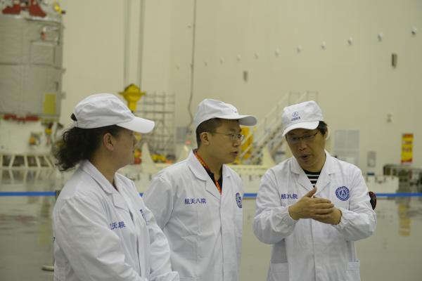 工作现场,顾侧峰副总指挥(右一)与技术人员进行交流。中国航天科技集团公司上海航天技术研究院 供图