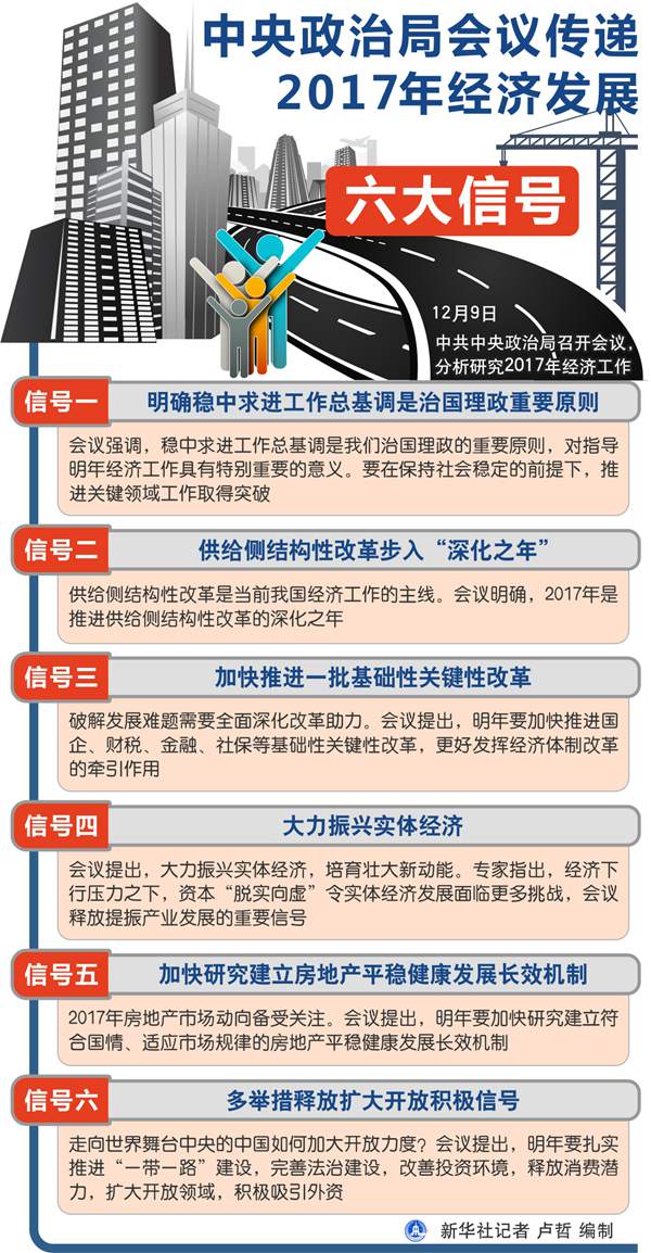 ![]() 中共中央政治局25日召开会议,分析研究当前经济形势和经济工作。 会议认为,今年以来,在错综复杂的国内外形势下,各地区各部门按照党中央决策部署,主动适应经济发展新常态,坚持新发展理念,坚持以推进供给侧结构性改革为主线,积极推进结构调整和新旧动能转换,有效防控风险,推动经济社会发展取得了来之不易的成绩。 会议关于当前经济形势和经济工作的表述,释放出六大重要信号。 信号一:一季度经济实现良好开局 会议指出,一季度经济运行稳中向好、实现良好开局。各方面对新发展理念和供给侧结构性改革的认识逐步加深、行动更为自觉,这对转变经济发展方式、保持经济平稳健康发展具有重要意义。 【背景】一季度中国经济增长6.9%,实现自2015年第四季度以来的最高季度增速。市场预期改善,工业支撑力有所提升;消费基础性作用进一步巩固,一季度对经济增长贡献达到77.2%;产业优化升级不断推进;一季度城镇新增就业334万人;城乡居民收入“跑赢”GDP增速。 【点评】“经济发展稳中向好的态势在加强,回暖具有一定可持续性。”国家发展改革委副主任、国家统计局局长宁吉喆说,今年以来,供给侧结构性改革持续向深入推进,积极效应不断释放。市场延续去年三季度以来的复苏势头,企业敏锐抓住市场变化,进一步释放活力。在新发展理念和供给侧结构性改革指引下,全国上下苦干、实干、撸起袖子加油干,为首季经济良好开局奠定基础。 信号二:坚定不移推进经济结构战略性调整 会议指出,在充分肯定成绩的同时也要看到,当前经济向好有周期性等因素,经济结构调整任重道远,面临不少挑战,必须坚持用新常态的大逻辑研判经济形势,坚定不移推进经济结构战略性调整。 【背景】当前区域和行业走势依然存在分化,部分地区产业结构较单一,市场经济发展尚不充分,面临较大压力;一些产能过剩行业供大于求的矛盾尚未得到根本解决;工业投资增速仍低于全国投资平均增速;金融风险不容忽视。 【点评】中国国际经济交流中心信息部部长王军说,当前我国经济发展长期积累的结构性矛盾依然存在,在部分地区、部分领域还比较突出,不乏“穿旧鞋走老路”、依靠投资拉动而非创新驱动发展的现象。推进经济结构战略性调整,要更多关注“战略性”一词的深刻含义,在经济发展新常态下,更多从中长期着眼、从供给侧着眼,坚定不移推进结构调整,在不断化解矛盾和风险中实现转型升级。 信号三:确保不发生系统性金融风险 会议指出,要高度重视防控金融风险,加强监管协调,加强金融服务实体经济,加大惩处违规违法行为工作力度。 【背景】当前金融风险总体可控,但金融领域存在不良资产、债券违约、影子银行、互联网金融等累积风险,金融违规违法和腐败行为时有发生。 【点评】民生银行首席研究员温彬说,近几年金融创新加快,但个别金融机构的过度趋利行为导致风险跨市场、跨领域交叉传染。在现有监管框架下,要发挥好金融监管协调部际联席会议制度的作用,形成监管合力,摸清风险底数,消除“脱实向虚”的高风险金融业务,让更多金融业务为实体经济服务,严守不发生系统性金融风险的底线。 信号四:确保供给侧结构性改革得到深化 会议指出,深化供给侧结构性改革,坚定不移推进“三去一降一补”,改造提升传统动能,大力培育发展新动能,振兴实体经济,实现转型升级。 【背景】今年以来,供给侧结构性改革在去年基础上向深入推进,经济延续稳中向好的发展势头,积极变化不断增加。2017年是推进供给侧结构性改革的深化之年,“三去一降一补”五大任务将取得实质性进展。 【点评】“一季度经济运行开局良好,既是供给侧结构性改革深入推进的成效显现,也为改革进一步深化奠定了基础。”国务院发展研究中心研究员张立群说,下一步要在处理好政府和市场的关系、努力实现新旧动能转换等方面着力,用改革的办法深入推进“三去一降一补”,为经济发展营造公平良好的市场环境。 信号五:加快形成促进房地产市场稳定发展的长效机制 会议指出,要加快形成促进房地产市场稳定发展的长效机制。 【背景】去年9月底开始,包括一线城市和热点二线城市在内的多地拉开房地产调控序幕;今年3月以来,热点城市限贷、限购力度再度升级,取得初步成效。但房地产市场存在的深层次矛盾尚未有效解决,一、二线城市房价上升的压力仍然存在,三、四线城市去库存压力仍然较大。 【点评】首都经济贸易大学土地资源与房地产管理系主任赵秀池说,长效机制的建立对稳定房地产市场、实现“房子是用来住的,不是用来炒的”的定位至关重要。长效机制既要符合国情,也要适应市场规律,其内容应包括:供求双向调节,实现供求平衡;根据不同住房需求采取不同政策,有保有压,在满足基本住房需求的同时,抑制投机投资性需求;大力发展租赁市场,建立购租并举的住房制度;为城镇化提供符合需要、适销对路的多元化土地及房产;落实地方政府责任,因城施策制定房地产调控政策。 信号六:扩大改革受益面 会议指出,要创造性开展工作,加强调查研究,充分发挥和调动基层干部群众积极性、主动性、创造性,扩大改革受益面,扎实做好重点民生工作,让人民群众有更多获得感。 【背景】为实现全面建成小康社会的目标还需攻坚克难,当前主要领域“四梁