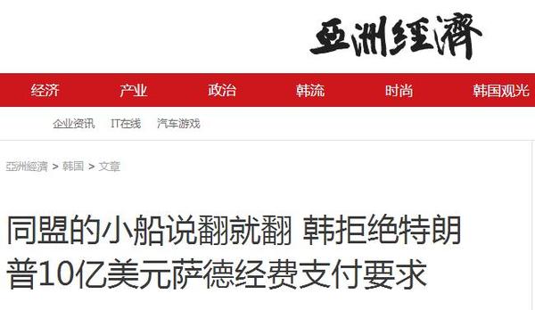 报道截图 美国总统特朗普当地时间27日在接受英国路透社采访时表示,韩国应向美国支付10亿美元的“萨德”反导系统部署费用。韩国国防部随后作出回应称,布设并使用“萨德”系统所需经费应由美方承担,韩方的这一基本立场没有变化。韩国《亚洲经济》4月28日对此评论称,“同盟的小船说翻就翻”。 报道称,特朗普直接提及“萨德”部署相关费用尚属首次。特朗普称:“已经向韩国通报应该由韩方支付部署费用,那可是价值10亿美元的系统,可以直接拦截导弹。” 28日,韩国国防部回应,根据《驻韩美军地位协定》(SOFA),应由韩国政府提供部署用地、基础设施等,而布设并使用“萨德”系统所需经费应由美方承担,韩方的这一基本立场没有变化。 韩联社4月28日分析称,“萨德”部署费用由哪方承担与萨德雷达电子波是否有害一样,始终是争论焦点。而特朗普的此番发言或导致两国政府重新就部署费用进行商讨,韩方被“倒打一耙”或会激起韩国国内波平浪静的“反萨论”再次发酵。 特朗普还在采访中谈及美韩贸易以及朝鲜问题。在美韩贸易问题上,特朗普称,美国与韩国的贸易存在巨大赤字,希望结束或重新对韩美自由贸易协定(FTA)进行协商。韩媒称,这是美方同时继“再协商”后,也是首次使用“结束”FTA一词。