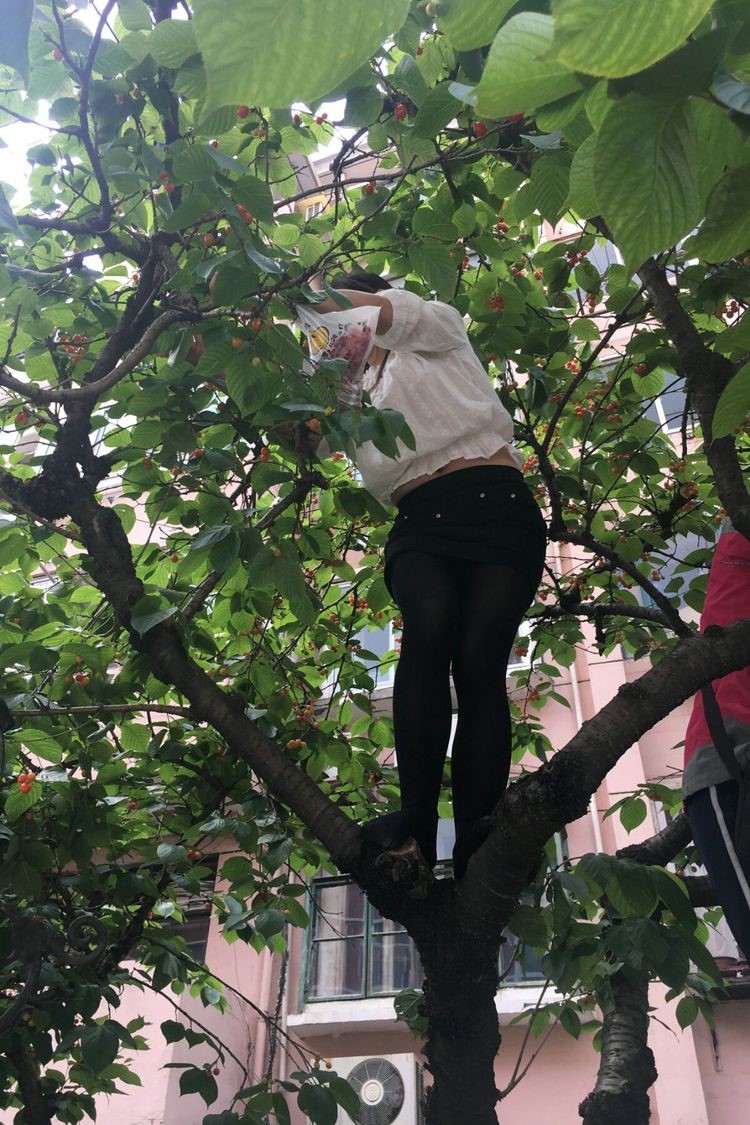 这些人还凶得很,如果谁要出面阻止,他们不但不收手,还会对着你用某种方言骂。以致近旁的门卫也不敢来管。那次我经过树下,只见两个老人带着一个小孩在摘樱桃,可能是刚从幼儿园把孩子接回来。孩子见到鲜红的樱桃,便要去摘,两个老的二话不说就下手了。那个老头也许是当爷爷的,竟站在电动车上,去摘高处的果子。我实在看不过去了,就上前阻止,老头先是不理不睬,后来看到许多居民都来指责,这才收手,带着孩子走了,一边走一边嘴里还骂骂咧咧的。