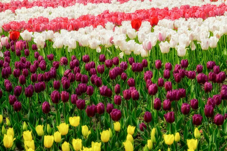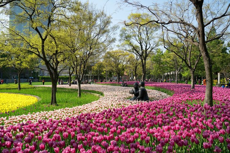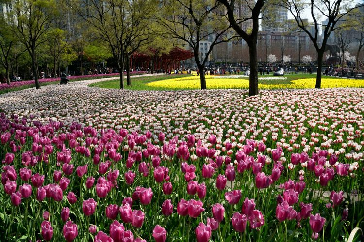 现在的静安区变得蛮大蛮大。仅指染尽春色的郁金香大花圃,就有两处:大宁绿地公园有,静安雕塑公园也有。所不同的是大宁公园紧挨马戏城,而雕塑公园就座落在上海自然博物馆园中。一个周日的下午,走进大宁绿地公园。果然,满目绚丽的郁金香摇曳着奔放的色彩像一场来自欧洲华贵的盛装舞会,在大量涌入园内的游客眼前欢快舞动。