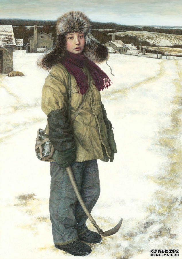 孔喜在作品中描绘了毛主席像章,军大衣、军用书包和水壶,还有挺拔昂扬的身姿,都是政治激情时代特有的图像和肢体符号;狗皮帽子,原始劳动工具和纯净无瑕的神情,则传递出农业生活中的纯厚美感。当然,构成这种美感的核心元素,不是体现社会意识形态的服饰和生活用具,而是自然生命中青春年华的美好。