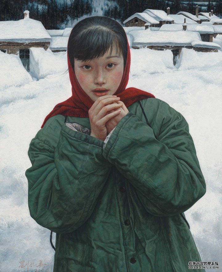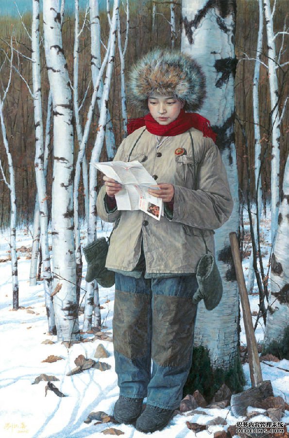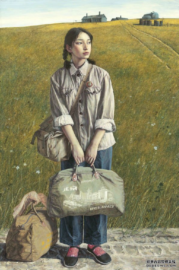 作者对道具的刻画写实至极,镰刀、帽子、旧水壶、农田鞋、旅行袋、搪瓷茶缸、皮手套、信封、像章,都有着强烈的视觉真实感。孔喜以知青为题的这组油画作品,以古典手法完成,形象动人,内容质朴,是对特殊时代中人物的造像,自有其不可替代的历史价值和艺术价值。