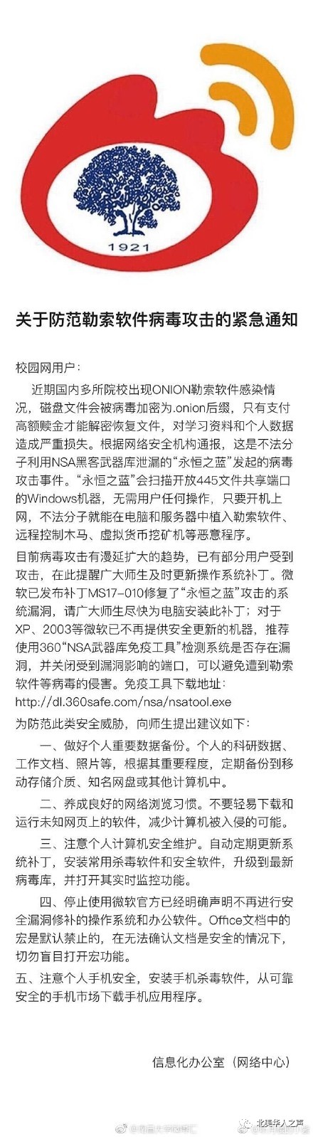 全球已感染范围 欧洲大陆,美国,以及俄罗斯最新情况不详。但是可以确定的是,也有很多电脑中招。 目前微软已发布补丁MS17-010修复了“永恒之蓝”攻击的系统漏洞。所以说,升级是王道。至于不再提供安全更新的XP、2003等系统,专家的说法是推荐使用“NSA武器库免疫工具”检测系统是否存在漏洞,并关闭受到漏洞影响的端口。据说,现在受灾端口已经从445,扩大到了135、137、138、139等端口。 而到底是谁在发起这场网络战争,现在的说法还是官方调查ing. 一般来说,有底线的黑客们喜欢黑国安局国防部CNN银行,不会丧心病狂的攻击求死扶伤的医院系统,也不会要挟穷学生。而CNN在报道中,罕见的插入一段录像,讲诉ISIS是如何招募网络黑客的。而比特币,因为其交易的虚拟性,正好是全球反洗钱的监管灰色地带。 值得一提的是,这次爆发,是有人利用NSA黑客武器库泄漏的“永恒之蓝”病毒发起了网络攻击。NSA的黑客武器库泄漏问题,早已经被斯诺登披露绝密文档证实。据2016年8月份的报道,黑客组织“影子经纪人”(Shadow Broker)宣称:已黑进美国国家安全局(NSA)“方程式”黑客小组,并盗取大量黑客工具和漏洞利用代码,并以5.65亿美元的价格在网上打包出售! 为了证明自己确实黑掉了NSA旗下的全球最顶级的黑客部队(震网和火焰的开发者),影子经纪人在网上释出了一些方程式小组的武器库文件供安全界各路专家围观鉴定。 据悉,此次黑客所使用的工具是由“方程式”实验室开发的。而方程式,又据说和“Five Eyes”在一条阵线上。后者为美国国家安全部以及美国的盟友澳大利亚、加拿大、新西兰以及英国5个国家牵头组织的情报共享组织。 作为一个啥都不懂的电脑白痴,唯有祈祷受攻击的医院里所有病人平安。 中国国内一学校信息化办公室对校园网用户的提醒和建议 针对勒索软件对医院下的毒手,网友们纷纷谴责这种做法的冷酷无情,有网友甚至表示,这比恐怖袭击还令人发指。很多网友则因此对大信息时代表达了莫名的恐慌。 很多中国网友已经纷纷表示,他们也已中招: Daniielx:表示已经中招,所有文件全部破损,作业,画的图,一张一张收集了2年的素材资料,全没了 阿普噗噗噗:就这么说吧,现在毕业季,我隔壁寝室就有妹子中招了,我们是动画专业,如果我们专业没提前备份的话,她的所有图片,视频都打不开了,那我们的毕设基本就废了,因为AE之类的工程文件是认导入的路径的,一旦源文件打不开,毕设基本上就算没了(PS:我们毕设给的时间是一年。如果没了那就是一年白画了) 有网友则进行了一些思考。对此,“北美华人之声”微信公众平台深以为然。希望全球政府能够携起手来,阻截不受监管的比特币,而个人用户,最好防患未然,多备份数据。 FORTRESS-45:又是业界毒瘤比特币。。如果赎金是结算通道受到严密监督的实体货币,恐怕黑客也不会如此嚣张吧。 等着收信的汉子:现在的社会已经离不开网络了,小到吃饭定餐、大到飞船上天,如何有效防范网络安全风险是网络时代维护国家安全和社会稳定以及公众利益的重要使命,迫在眉睫,刻不容缓。” “老姐姐我只为喜欢的人开出花儿”给出了以下建议: 1、不要给钱。赎金很贵并且交了之后未必能恢复。 2、未中毒的电脑迅速多次备份数据。已中毒的,重装系统前把硬盘低格,然后安操作系统。 3、安装反勒索防护工具,但仅在病毒侵入前有作用,但对已经中病毒的电脑无能为力,还是要做好重要文档备份工作。 “北美华人之声”将继续密切关注事态进展。 (责任编辑:晓歌) |