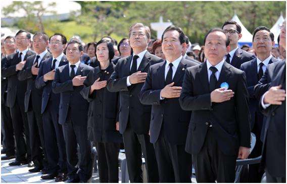5月18日,韩国迎来了“光州民主化运动”37周年。当天上午,韩国总统文在寅以及韩国各政党代表前往光州参加悼念“民主英烈”的纪念活动。当天,参加活动的人数达到1万多人,创下历史最高。而“光州民主化运动”主题歌《为斯人的行进曲》也重新“高调”亮相——包括文在寅在内的众人,手挽手高声齐唱此歌,以此缅怀为韩国民主运动牺牲的人,场面令人动容。自2009年开始,此曲便被韩国保守派执政者视为“禁歌”,保守派还表示此曲有歌颂金日成的嫌疑。这是时隔9年后,该首歌第一次以众人齐唱的方式亮相纪念活动,此举被视为韩国保守党10年执政终结的象征。