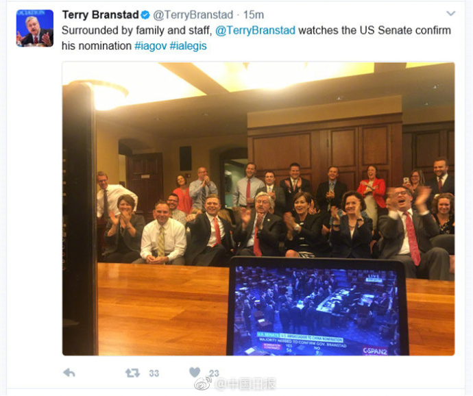 特里·布兰斯塔德 新华社快讯:美国国会参议院22日批准艾奥瓦州州长特里·布兰斯塔德为新任驻华大使。 据央视消息,预计其尚需1个月左右交接再赴任。 这位70岁的共和党人担任艾奥瓦州州长一职长达22年,是美国历史上任期最长的州长。当天他也在社交账号上发布了和家人及同事在州长办公室观看参议院投票的照片。