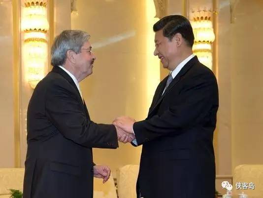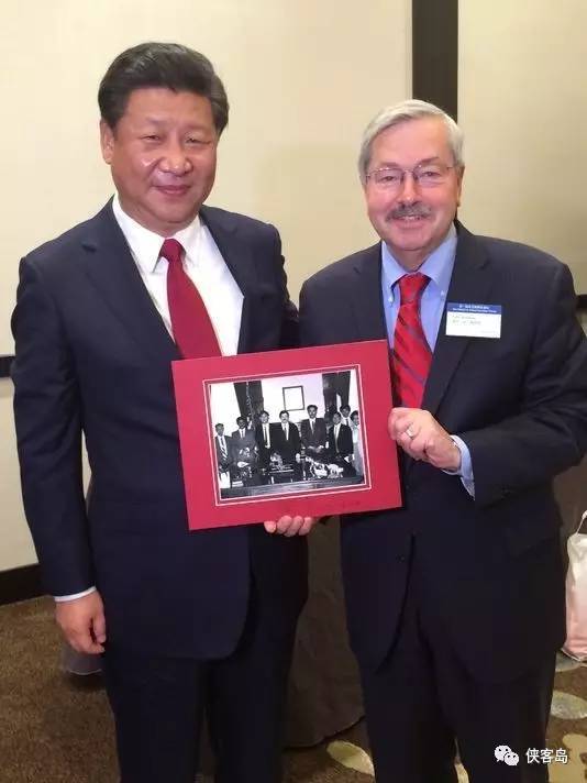 州长手捧的照片正是拍摄于1985年习近平率团访问期间 多年之后,习近平和布兰斯塔德又于2011年9月再续前缘。 再次担任州长的布兰斯塔德访问中国,受到了时任国家副主席的习近平的接见,两人交谈了近一个小时。五个月之后,习近平再访艾奥瓦州,回到阔别27年之久的马斯卡廷,见见当年的老朋友。后来,就任国家主席的习近平又分别在2013年于中国、2015年于美国见到了自己这位相识多年的老友。布兰斯塔德也对这份友谊倍感珍惜和荣耀,据说,任何与他共处一室超过5分钟的人都知道一件事——布兰斯塔德最喜欢讲的故事就是他与中国国家主席习近平的那些往事。