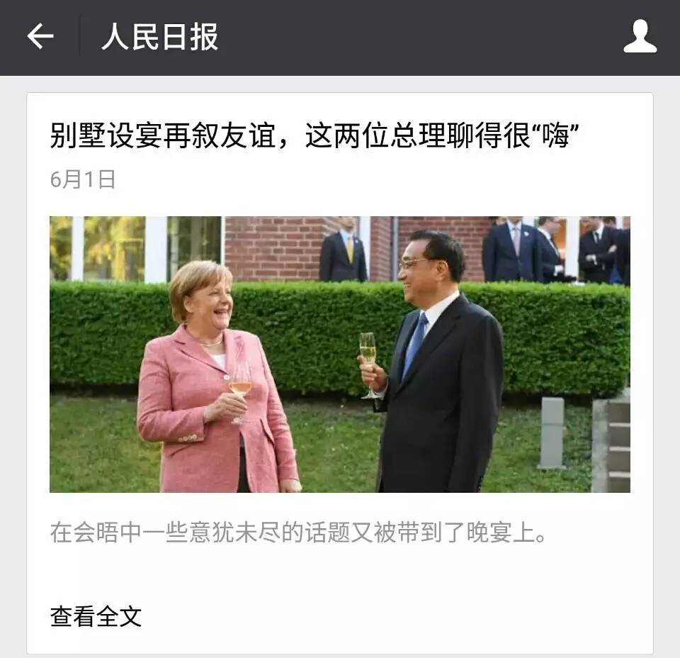 图片来源:中国政府网 而对于两国总理的会晤,人民日报用“两位总理聊得很‘嗨’”来形容现场的气氛,这也预示着中德更加友好的未来。