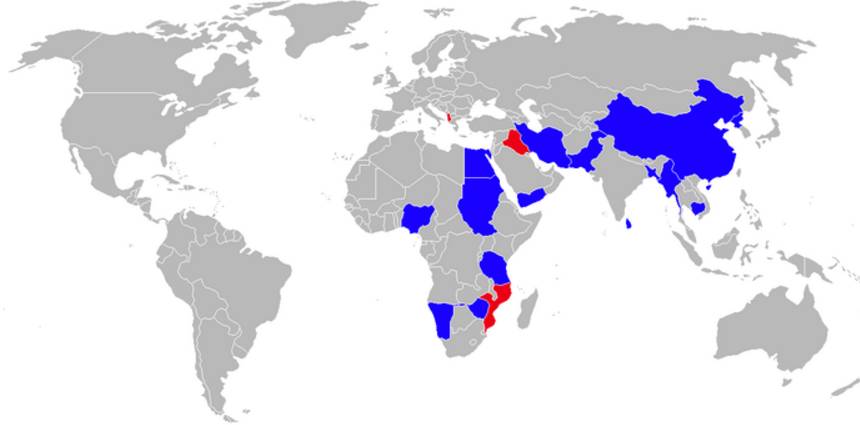 自上世纪60年代末以来,中国已向阿尔巴尼亚、孟加拉国、埃及、津巴布韦、伊拉克、伊朗、朝鲜、缅甸、巴基斯坦、苏丹、坦桑尼亚和斯里兰卡提供了超过500架各种改型的歼-7系列战机。环球网2015年的统计显示,歼-7系列战机性能优越,价格公道,以高性价比的优势无可争辩的成为中国飞机出口冠军。下图中为2010年歼-7服役国家分布,蓝色为现役国家,红色为曾经服役国家。